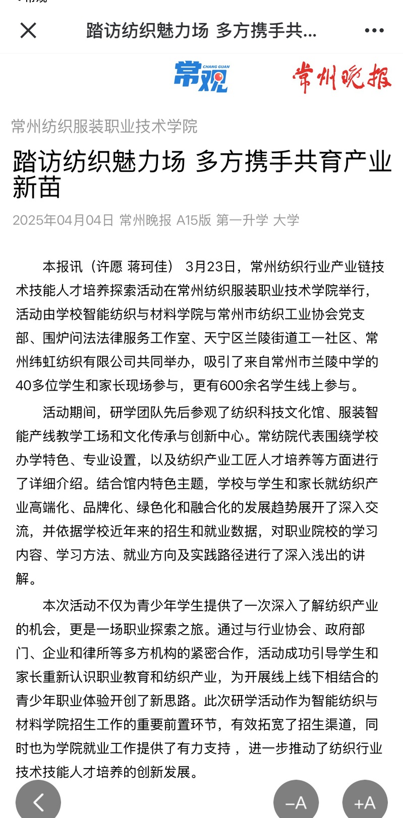 學(xué)雷鋒、做志愿、服務(wù)改革建新功——我校開(kāi)展學(xué)雷鋒志愿服務(wù)月活動(dòng)2025-04-07為深入貫徹落實(shí)習(xí)近平總書(shū)記關(guān)于弘揚(yáng)雷鋒精神的重要論述,深刻把握雷鋒精神的時(shí)代內(nèi)涵,引領(lǐng)常紡青年在志愿服務(wù)實(shí)踐中大力弘揚(yáng)“奉獻(xiàn)、友愛(ài)、互助、進(jìn)步”的志愿服務(wù)精神,今年3月,以“學(xué)雷鋒、做志愿、服務(wù)改革建新功”為主題,系統(tǒng)部署開(kāi)展2025年“學(xué)雷鋒”志愿活動(dòng)月專項(xiàng)活動(dòng)。通過(guò)組織全校師生開(kāi)展30余場(chǎng)主題鮮明、形...省委第十巡視組巡視常州紡織服裝職業(yè)技術(shù)學(xué)院黨委工作動(dòng)員會(huì)召開(kāi)2025-04-04根據(jù)省委關(guān)于巡視工作的統(tǒng)一部署,2025年4月2日,省委第十巡視組巡視常州紡織服裝職業(yè)技術(shù)學(xué)院黨委工作動(dòng)員會(huì)召開(kāi)。省委第十巡視組組長(zhǎng)李圣華作了動(dòng)員講話,對(duì)深入學(xué)習(xí)貫徹習(xí)近平總書(shū)記關(guān)于巡視工作的重要論述、關(guān)于教育的重要論述和對(duì)江蘇工作的重要講話精神,認(rèn)真貫徹落實(shí)全省巡視巡察工作會(huì)議暨對(duì)村巡察工作推進(jìn)會(huì)、省委...